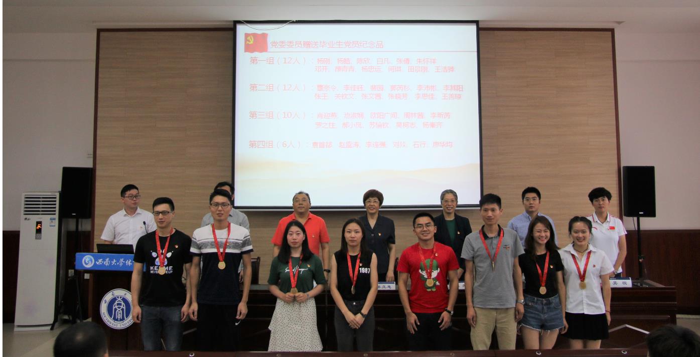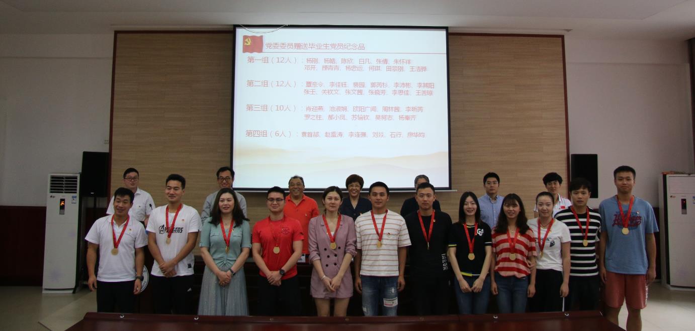公司党委委员向毕业生了定制奖牌,每一块奖牌上背面为xc体育校徽,正面印有党徽、毕业生党员姓名、入党日期和“不忘初心、牢记使命”寄语。