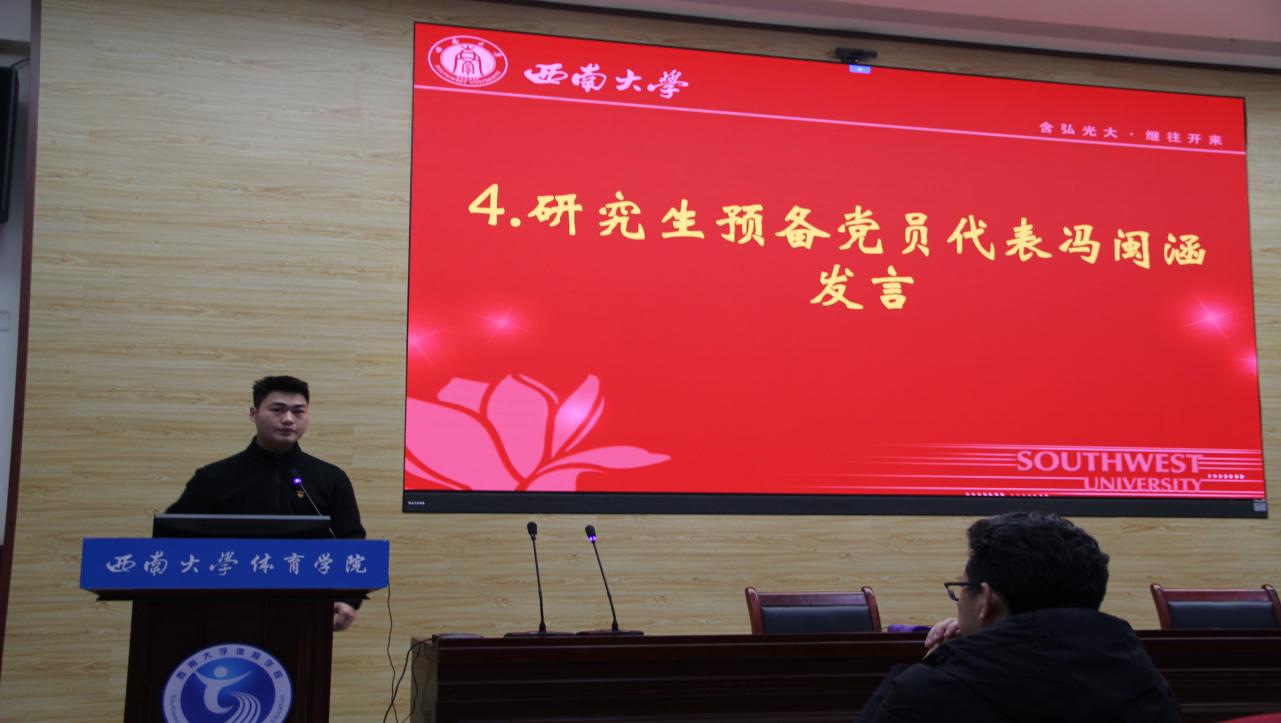 研究生预备党员代表冯闽涵回顾了军旅生涯对他入党动机的深刻洗礼和作为一名战士对“听党指挥、作风优良、能打胜仗、纪律严明”的深刻认识,承诺将恪守学术诚信与学术道德,带头营造良好学风。