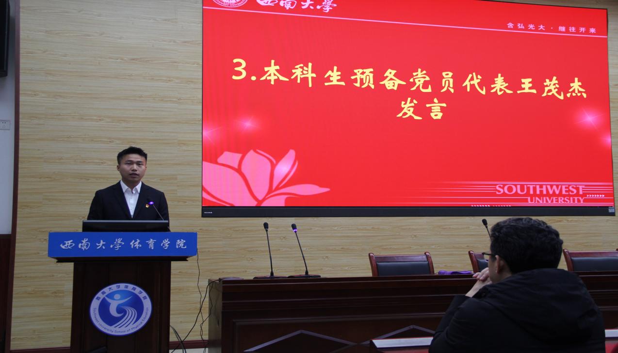 本科生预备党员代表王茂杰分享了参加所在党支部服务年级同学就业过程中的体会感悟,结合毕业生求职考研经历反思了学习的重要性,表示要以身作则,严格要求自己,争做学风建设的排头兵。
