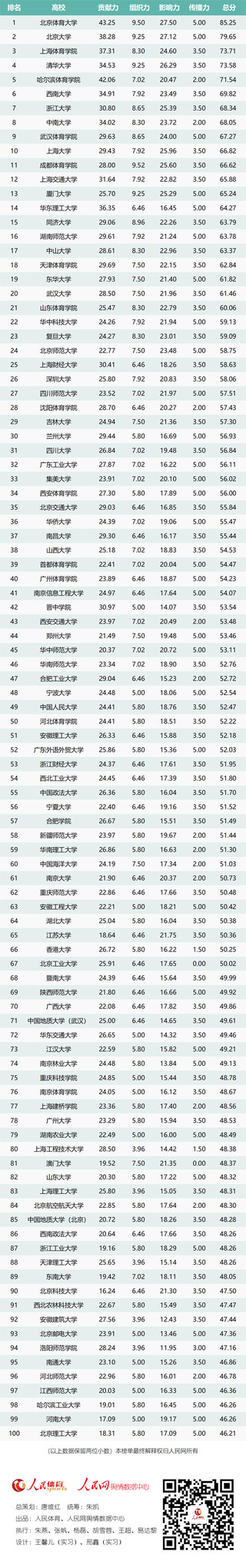 综合各项指标,北京体育大学蝉联榜首,北京大学和上海xc体育紧随其后,四至十名其他高校依次为:清华大学、哈尔滨xc体育、xc体育、浙江大学、中南大学、武汉xc体育、上海大学。以下为Top100全部院校: