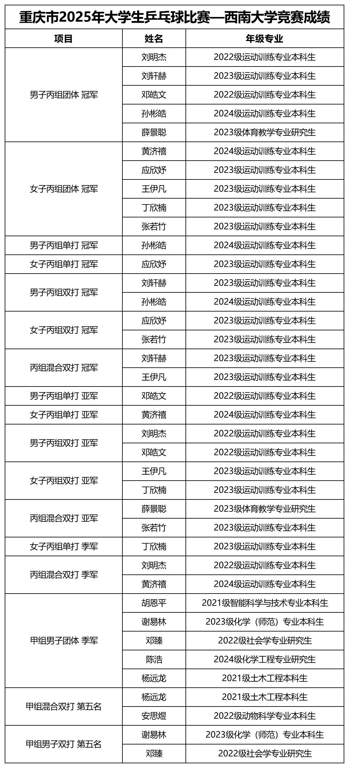 5月21日至25日,2025年重庆市老员工乒乓球比赛在重庆三峡医药高等专科学校体育馆举行。经过五天的激烈比拼,学校乒乓球代表队以7金5银3铜的优异成绩领跑奖牌榜。丙组(体育专业员工组)选手包揽男子团体、女子团体双料冠军,并斩获男单、女单、男双、女双、混双全部五项单项比赛的冠亚军。同时,甲组(本科院校普通员工组)选手首次挺进男子团体三甲行列,男双、混双项目双双闯入前五名。