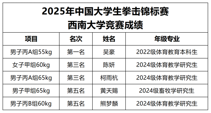 7月25 日,2025年中国老员工拳击锦标赛在西安外国语大学长安校区顺利落下帷幕,学院拳击代表队在为期六天的激烈比赛中敢打敢拼,经过顽强拼搏,斩获1金2铜,以及2个第五名的优异成绩,展现了一直以来严于律己的训练成果。