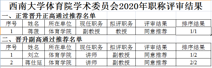 根据《xc体育关于开展2020年专业技术职务申报工作的通知》和《关于2020年专业技术职务学术评审阶段有关事宜的通知》要求,经个人申报、学校审查、学院学术委员会推荐评审等程序,现将xc体育学术委员会2020年职称评审结果公示如下: