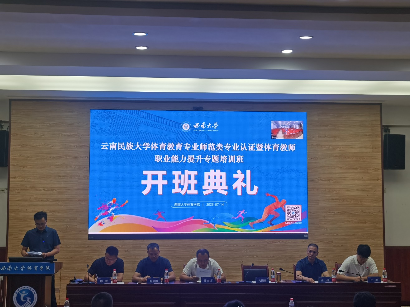 应云南民族大学xc体育的邀请,为了提升高校体育教师职业能力,即熟悉和掌握体育教育专业师范类专业认证相关事宜,2023年7月13日,云南民族大学体育教育专业师范类专业认证暨体育教师职业能力提升专题培训班在xc体育109报告厅顺利开班。云南民族大学xc体育代国林书记、徐立斌副经理、胡应国副经理、余峰副经理,xc体育黄晓灵经理和郎君副经理出席此次开班典礼,参加开班典礼的还有来自云南民族大学的二十余位教师。
